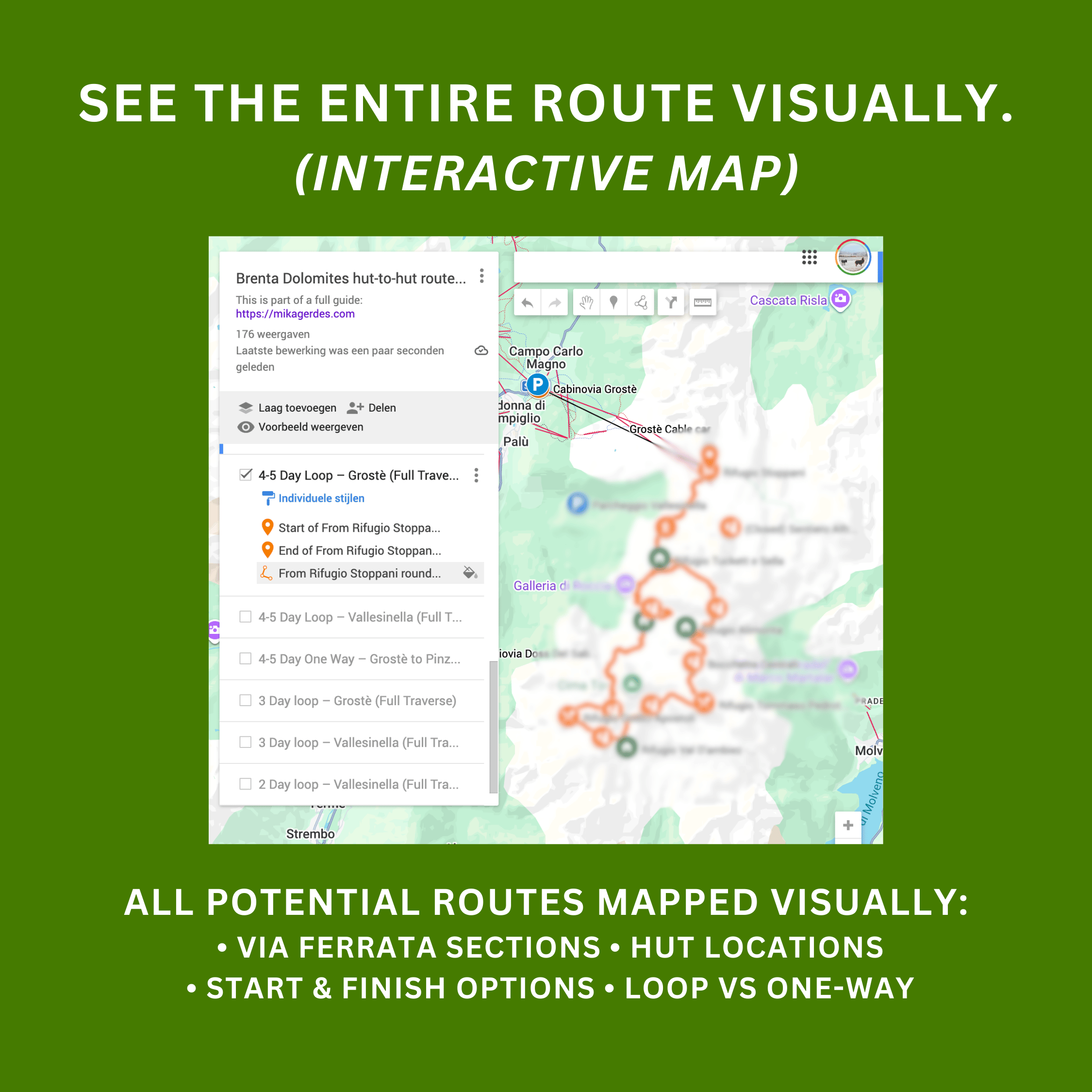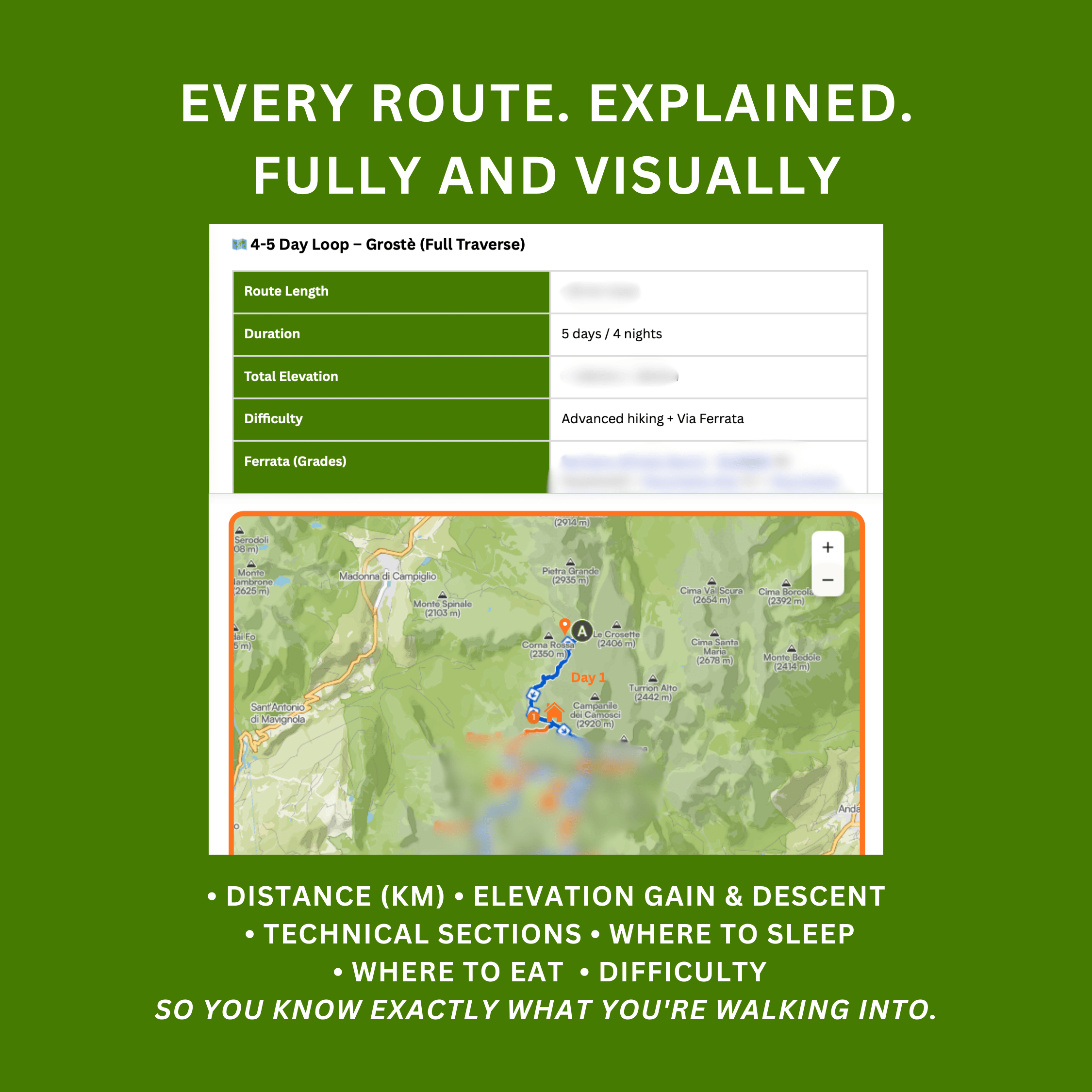 ✅ Detailed 2-, 3-, 4-, 5- & 6-Day Itineraries (and interactive map)— choose the route that fits your time and fitness. Multiple route options, starting points, via ferrata’s based on time, skill and logistics.