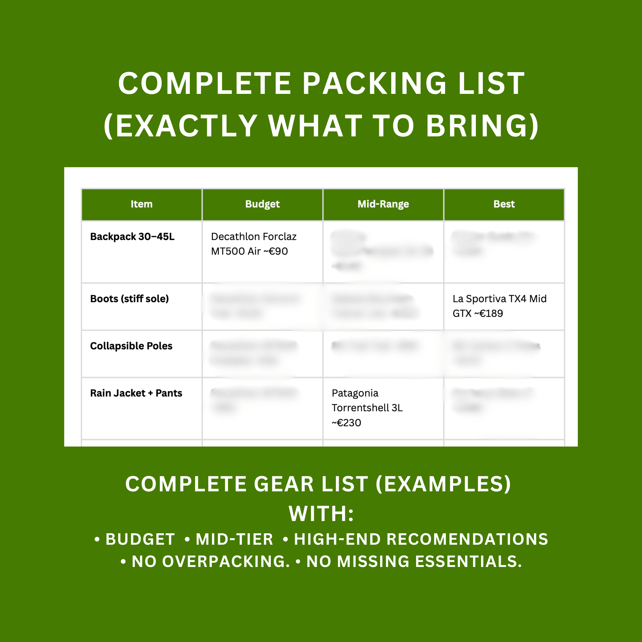 ✅ Gear & Packing Lists — optimized for weight & safety with exact products listed for (budget, mid and high end